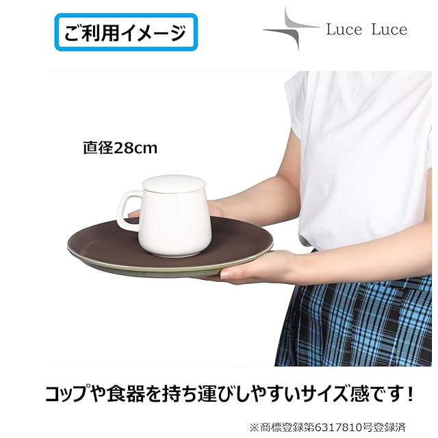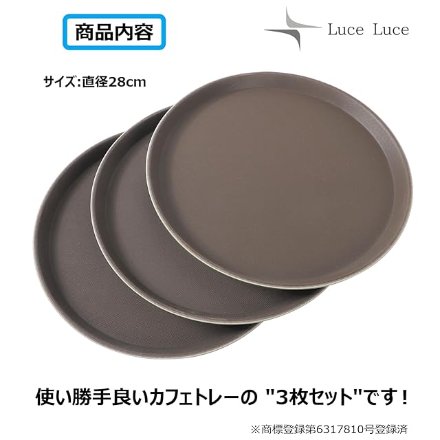 【商品内容】トレー お盆 直径 28cm 重さ280g 3枚セット 色:茶色・ブラウン 材質:ポリプロピレン製 ※お客さまの声を反映し軽量化を図るとともにトレー強度を強化しました!長くご利用頂くには最適です。本商品はLuce Luce(ルーチェ・ルーチェ)正規品です。類似品には十分ご注意ください。【持ち運びに便利なデザイン】カフェやレストラン、ホテルなどで多くで採用頂いている、シンプルかつ機能的なデザインです。ウェイターの皆さんの声をしっかり採用し、飲み物やお食事の持ち運びに便利なデザインを採用しました! 【耐久性もしっかり重視】耐久性も重視したポリプロピレン性のトレーです。汚れにも強く、サッと一拭きすることでいつも清潔にご利用いただけます。 【オリジナルブランド商品】本商品はLuce Luce(ルーチェ・ルーチェ)オリジナルブランド商品です。安心の商標登録:第6317810号登録済。ご購入から30日間は返品・返金対応が可能です。一つひとつ日本人スタッフが丁寧に検品しておりますが、万一輸送中の破汚損など商品に不具合がございましたら、お問い合わせくださいませ。弊社がしっかりと対応させていただきます。ルーチェ・ルーチェは充実のアイテムであなたの素敵な毎日を応援します!