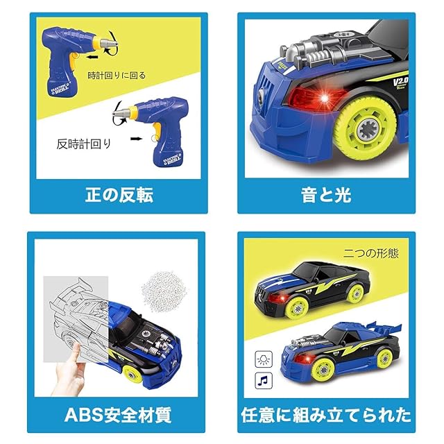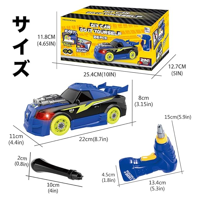 商品名:REMOKING DIY 車セット 組み立ておもちゃ ゃ 2IN1 車おもちゃ 大工 おもちゃ 子供用 サウンド ライト付き26ピース レースカー組立セット 工具セット ボルトを締め付け 走行可能 安全な塗料を採用 車おもちゃ 組み立て車 誕生日祝い プレゼント