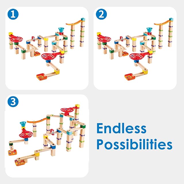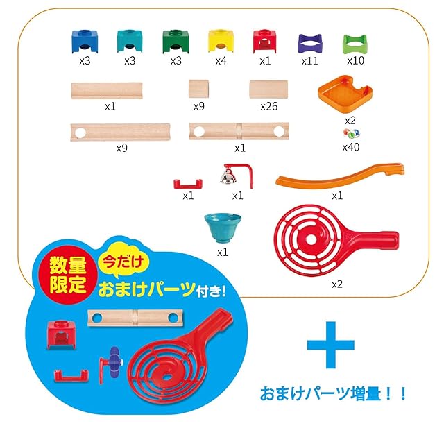 パーツの組み合わせで自由にコースを作れる木製のボール転がしデラックスセットの増量版!木製レールとプラスチックのジョイントパーツ、うずまきレールやロングスライダーなどのギミックパーツが入っています。