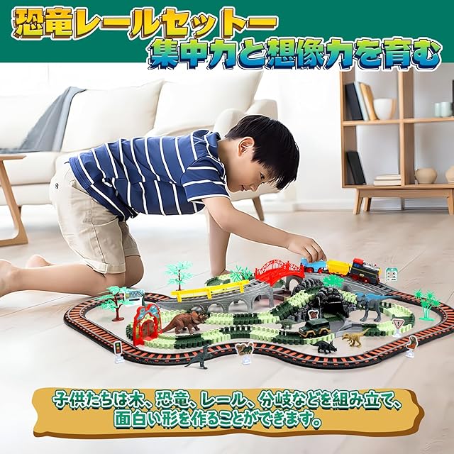 【恐竜レールセット】恐竜フィギュア、専用のカー、立体交差橋、トンネルなどの要素と組み合わせるレールで、子供たちは創造力と想像力を発揮し、自分たちの恐竜の世界を構築することができます。また、レールを組み立てることで、子供たちの手と目の協調能力を鍛えることができます。
