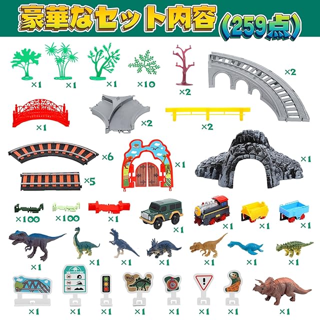 【セット内容259pcs】恐竜*8、カー*2、トンネル*1、木*15、レール部品*211、立体交差橋*2、自動軌道門*1、道路標識*7などの259点部品を含めています。