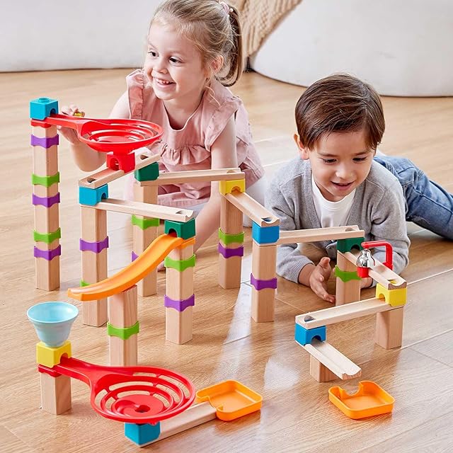 パーツの組み合わせで自由にコースを作れる木製のボール転がしのデラックスセット