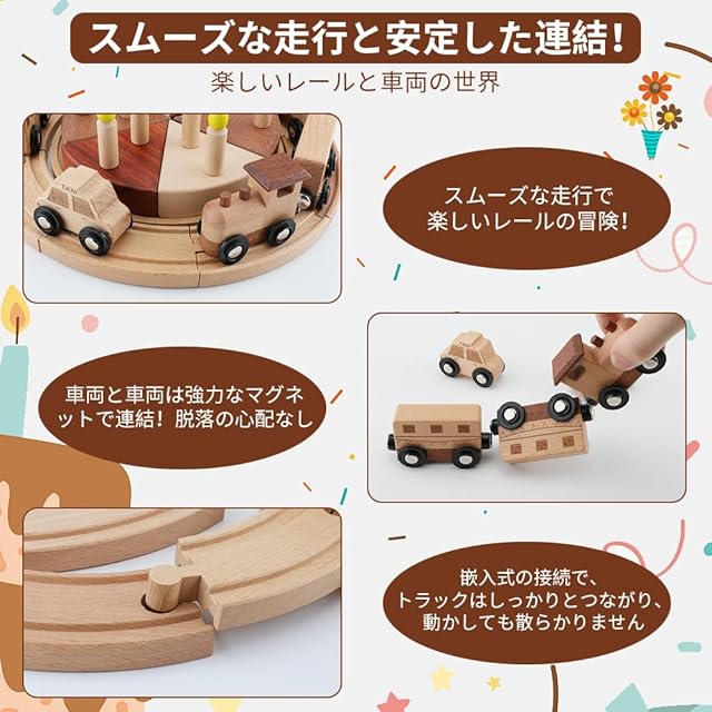 商品名:FlyCreat 積み木 レールブロックつみき 知育玩具 - 52pcs 組み立て 木のおもちゃ モンテッソーリ玩具 車 ケーキ 誕生日おままこと 積み木 2歳 3歳 木製 ブロック 指先訓練 子供向け 男の子 女の子 プレゼント