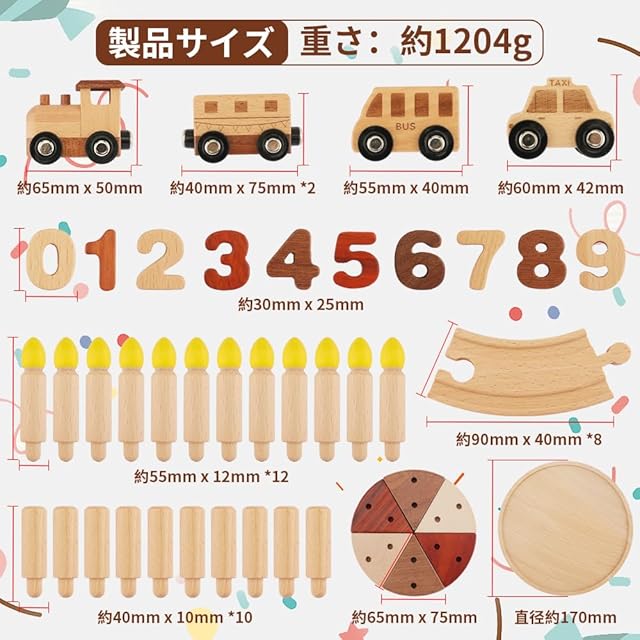 【詳細なサイズ情報】お子様の小さな手にぴったりのサイズで設計された各パーツは、安全かつ遊びやすいように作られています。火車車両は2台で、約40mm x 75mmのサイズ、火車頭は1台で約65mm x 50mmです。また、小さな車両1台(55mm x 40mm)と、バス1台(60mm x 42mm)も含まれており、様々な交通シーンを再現できます。特に、約90mm x 40mmのサイズの8つの木製レールが含まれており、トラックの組み合わせで無限のレイアウトが可能です。数字積み木は0~9の10個セットで、各ブロックのサイズは約30mm x 25mmとなっています。おままごと用のケーキ積み木は6個、サイズは約65mm x 75mm、直径170mmのケーキ台と一緒に遊ぶことができます。さらに、ろうそく積み木12個(約55mm x 12mm)と、小さな木の棒10本(約40mm x 10mm)で、細かなディテールにもこだわった遊びが楽しめます。