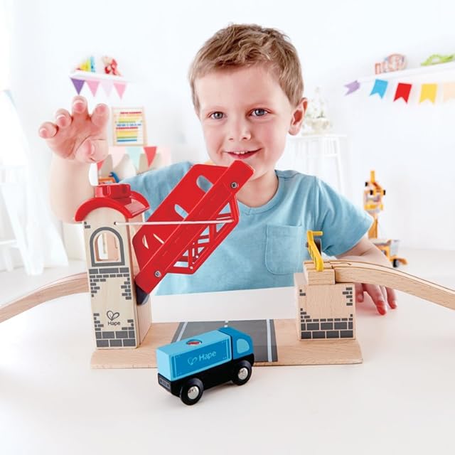 レール遊びを盛り上げる、跳ね橋です。つまみを回すと橋が上下に開閉し、クレーン車などの背の高い車も通れるようになります。ハペのレールシリーズといっしょに楽しめるので遊びの幅が広がります。