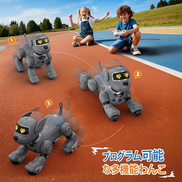 2025年最新版のリモコンロボット犬が登場!歩いたり、歌ったり、踊ったりするだけでなく、まるで本物の子犬のようにお子さまと遊び、成長を共にする知能型ペットです。犬 ロボット豊富な機能とインタラクションで、毎日の遊びに無限の楽しさをプラスします。 犬型ロボットには「フォローモード」が搭載されており、お子さまが歩くと忠実に後をついてきます。本物の犬を散歩させているような感覚を味わえます。さらに、無視されると吠えたり特技を披露したりして、「一緒に遊んで!」とアピール。ペットロボット 犬、お子さまは本当にペットを飼っているかのような温かい体験を得られます。 「Sit down」などの音声コマンドを出すと、電子 ペットが反応して動作します。全部で8種類の音声コマンドを搭載!さらに、あごやしっぽに触れると、ロボットペット犬異なる動作や音声で応答してくれるので、予想外のサプライズが楽しめます。 犬ロボット玩具遊ぶだけでなく、知育玩具としても大活躍!犬型ロボット プログラミング、最大100種類のアクションを組み合わせてプログラミングできるので、お子さまの論理的思考力や創造力を育成。STEM(科学・技術・工学・数学)分野への興味を自然に引き出し、楽しく学びながら成長をサポートします。 電子ロボット 犬お誕生日、クリスマス、お正月など、大切なイベントにぴったりの贈り物です。毎回違う遊び方や反応で、お子さまを飽きさせない特別なパートナーとなります。多機能で可愛い犬型ロボット、お子さまの笑顔と驚きを引き出す最高のプレゼントです。