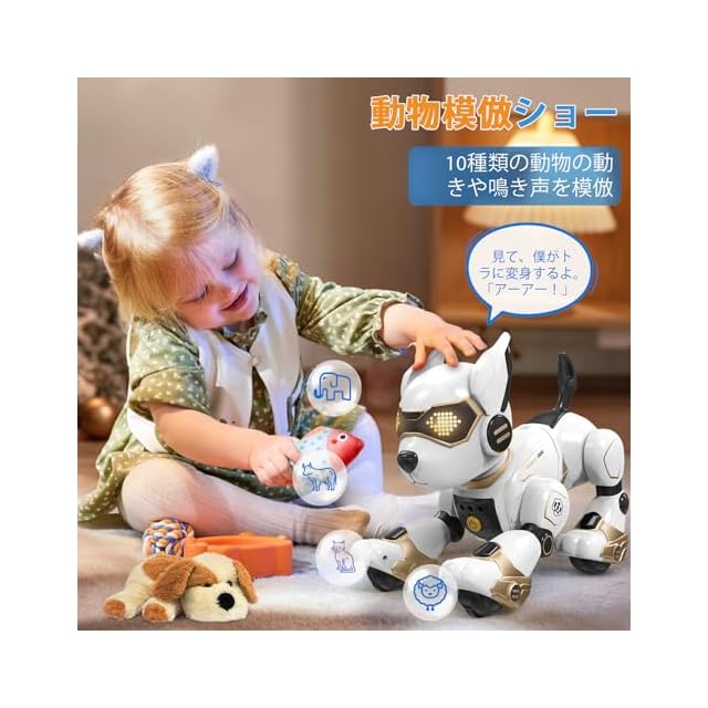 動物の鳴き声模倣ショー:このロボットペット犬は、猫、象、虎、羊、馬など、10種類の異なる動物の鳴き声を模倣することができます。この機能は、子どもがさまざまな動物の鳴き声を認識するのに役立ちます。リアルな音とのインタラクションを通じて、子どもたちはより臨場感のある、楽しい学習体験を楽しむことができます