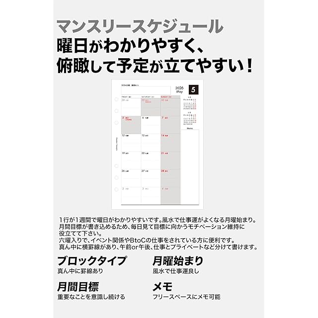 【 一目瞭然の見やすいレイアウト 】『書くときも見るときも時間がかからない』ユニバーサルデザインを意識しています。 1日1ページのデイリースケジュールは、見やすく変更も書きやすい30分目盛りのバーチカルタイプ。目標達成するためのタスク管理・目標欄、社内のコミュニケーション・円滑な業務にするための報告・連絡・相談欄。フリーに書けるメモ欄があります。“今日の名言” は朝礼のネタや思考の参考に。 月間スケジュールは六曜入り見開き1ヶ月のブロックタイプです。月間目標も記載できる欄があります。日曜日と祝日は赤字です。