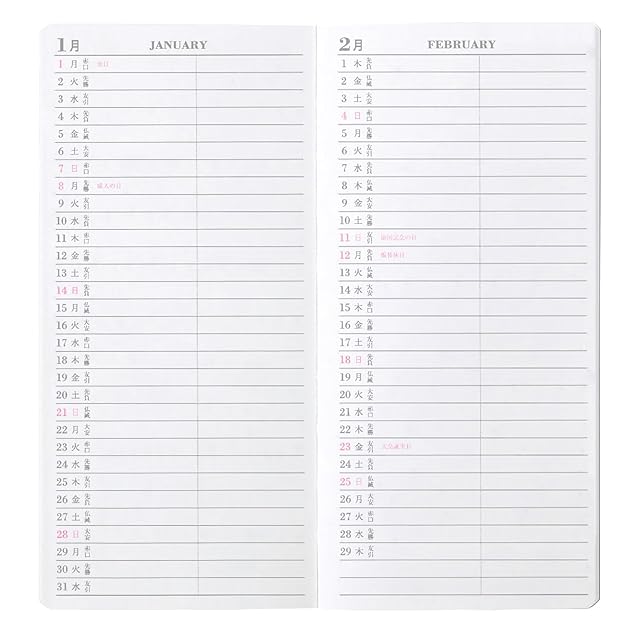 ・手に収まりやすく、ポケットに入れやすいスリムサイズ。・ひと月の予定を見渡しやすい、1ページ1か月分のマンスリーページ。・週の目標も記載できる、1ページ1週間分のウィークリーページ。・たっぷりかける、19ページのノート・メモページ付き。・重要事項控、パーソナルデータ等の付録ページ付き。・祝日、六曜の記載あり。