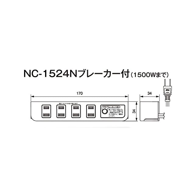 ノア 家具用コンセント(什器用) 4ヶ口コンセント 白 VFFコード1.9m 棚下直付タイプ 1500Wまで ブレーカー付 NC1524Nブレーカー付白