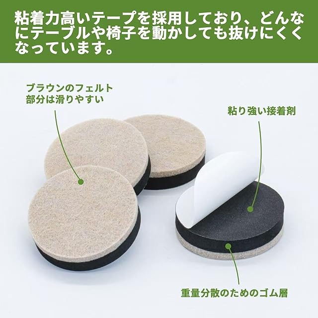 【高品質】耐磨耗性のあるフェルトを採用して作られた家具スライダーが頻繁に家具に使用しても大丈夫です。家具向き面はEVAフォームであり、ソフトで床への圧力を減らします。高品質素材を使用しており繰り返し利用することができます。当社のウッドフロア用スライダーには、厚手のフェルト、ゴムフォームを使用しています。 硬材用のスライダーの上部に接着部はありません。ゴムのフォームが家具をしっかりとずれないように固定しますので、長時間維持されます。