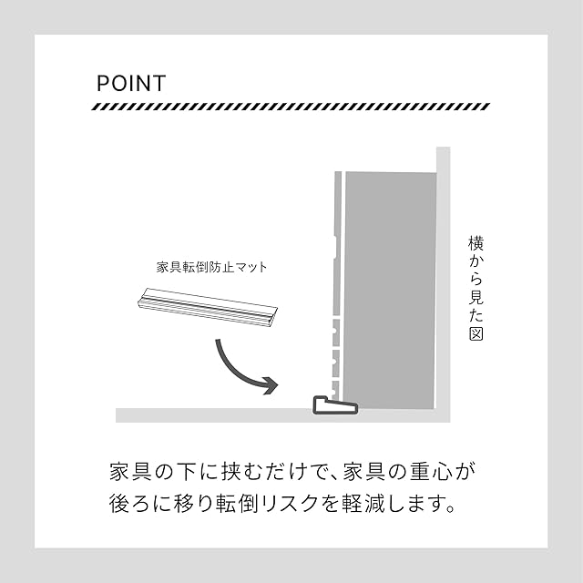 【簡単取付】工具不要。家具の下に挟み込むだけで、家具の転倒のリスクを低減。家具や床を傷つけずに設置。