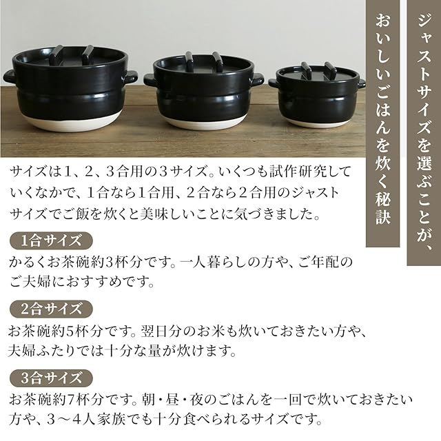 かもしか道具店では、「ごはんをおいしく炊く」ために、さまざまな大きさの鍋を使って炊き比べました。 その結果、1合炊くなら1合用、2合炊くなら2合用のジャストサイズでご飯を炊くことで、一番おいしいごはんができることにたどり着きました。 1.2.3合と3種類ありますので、生活スタイルに合わせて、ぴったりのサイズをセレクトしていただけます。 1合用は、お茶碗約3杯分です。一人暮らしの方や、ご年配のご夫婦の方におすすめです。 育ち盛りのお子様やよく食べられる方は、どんぶり茶碗としてそのまま使っていただけます。