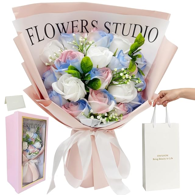 HWSHOW ソープフラワー 花束 造花 グラデーションカラー 誕生日 結婚記念日 プレゼント ギフト インテリア バラ 枯れない お花 手提げ付き メッセージカード付き 女性 母の日 敬老の日 還暦 バレンタインデー クリスマス 新年 彼女 送別会 退職感謝 お礼 昇進 転居 お見舞い グラデーションカラー