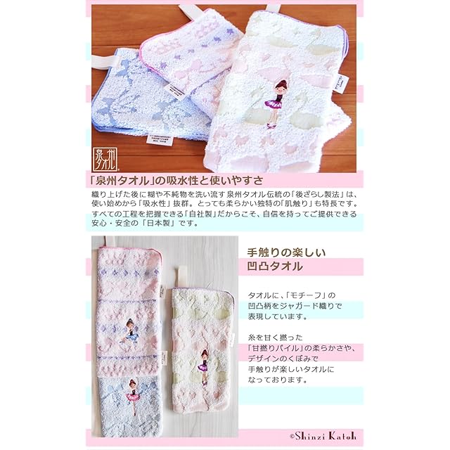 人気雑貨デザイナー「シンジカトウ」が「バレエ」をイメージしてデザインしたイラストを、タオル地にデコボコで表現し、バレリーナをワンポイント刺繍にして施しました。小物柄の背景に、かわいらしいバレリーナの刺繍、パステル調の優しい色づかいのデザインです。自分用はもちろん、ギフトや贈り物にも最適です。
