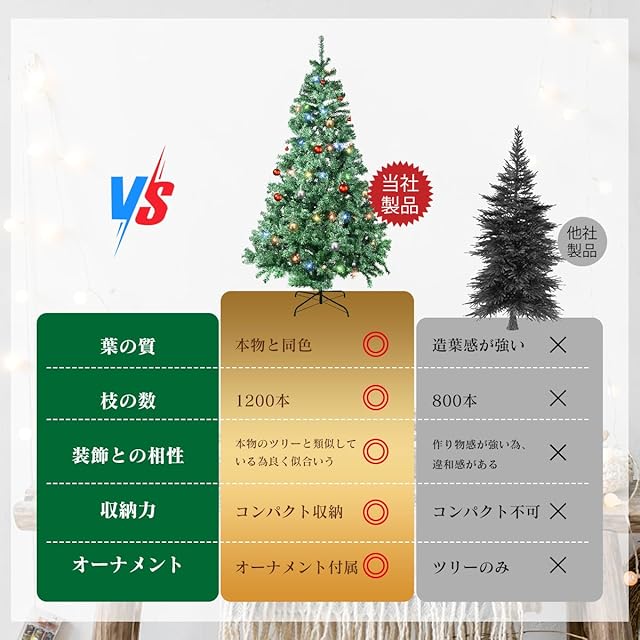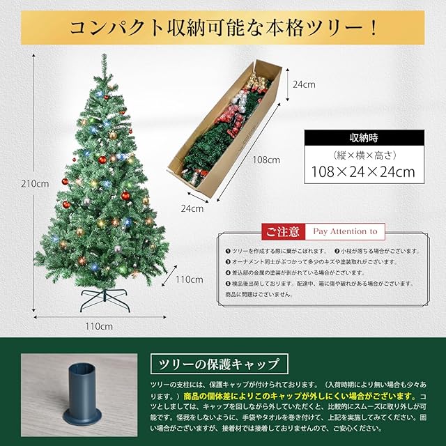 【組立簡単&収納便利】 工具不要で女性一人でも簡単に組み立て可能。使用後は枝をたたんでコンパクトに収納でき、毎年繰り返し使えるエコ仕様です。人工素材のため、針葉の落下やお手入れの手間もありません。