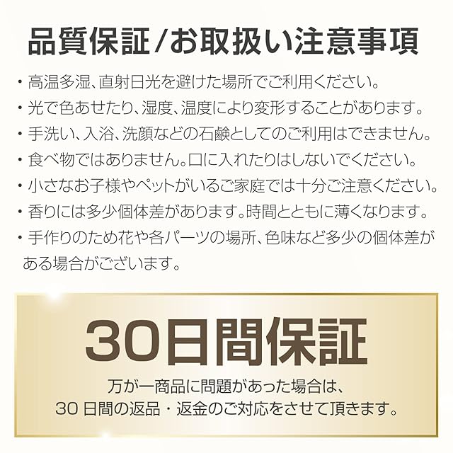 【注意事項】石けんとしてお使い頂く事ができません。鑑賞用のみとなります。お風呂に持ってはいったり、水には濡らさないでください。高温多湿・直射日光はお避け下さい。光で色あせたり、湿度、温度により変形することがあります。食べ物ではありません。口に入れないでください。小さなお子様やペットがいるご家庭では十分ご注意ください。香りには多少の個体差があります。時間とともに香りは薄くなります。手作りの為、花や各パーツの場所、色味など多少の個体差がある場合がございます。お届け商品に万が一不具合がございましたら、遠慮なくご連絡ください。