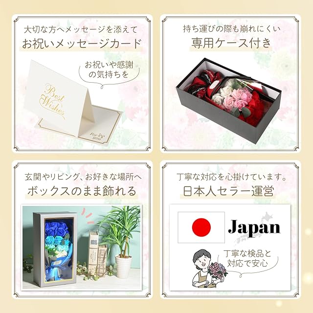 【ギフトボックス付】ギフトボックスに入っていて、花が崩れにくい。ブレゼントとして渡しやすいです。