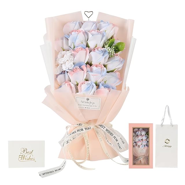 Moluppy ソープフラワー 花束 持ち運びに便利な 紙袋付き ボックス付き バラ 18本 スノーピンク 薔薇造花 誕生日 記念日 お祝い 送別会 ギフト プレゼント